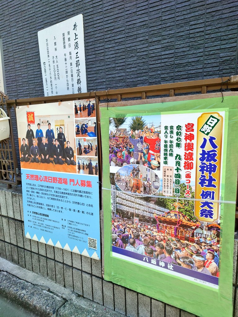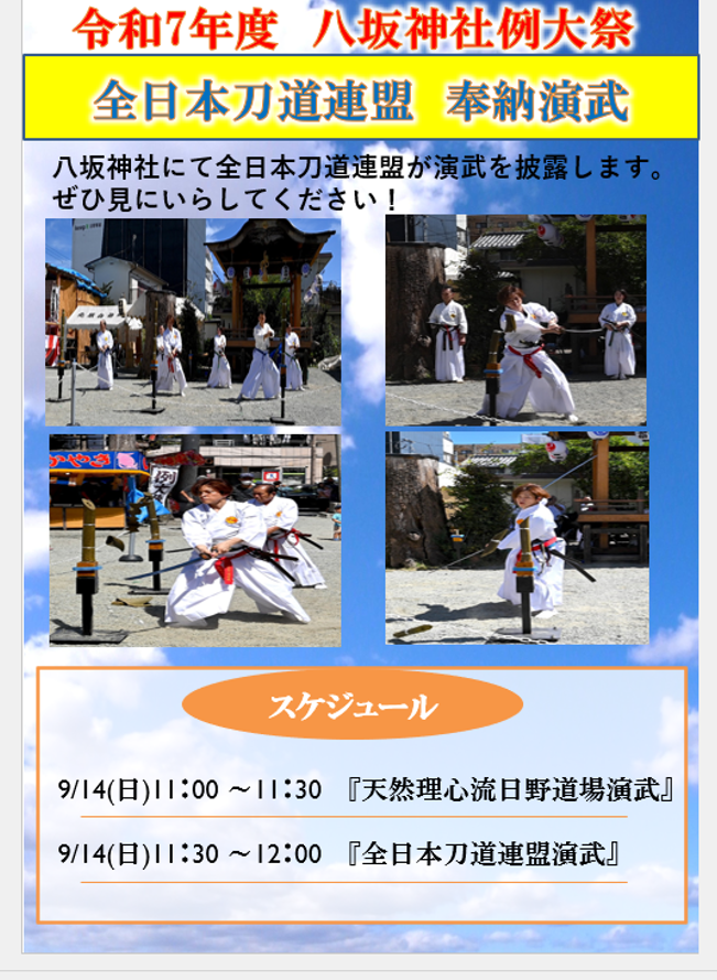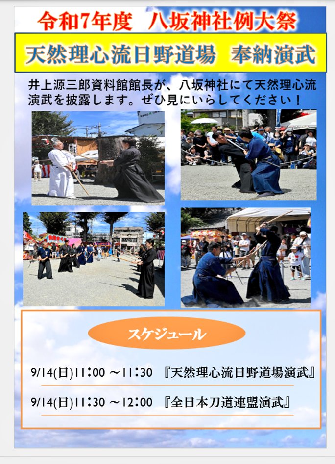 【令和7年八坂神社例大祭奉納演武】 お知らせ 2025.08.21 日野市八坂神社例大祭にて『八坂神社奉納演武』を行います✨令和7年9月14日(日)11:00~天然理心流日野道場11:30~全日本刀道連盟井上源三郎資料館館長も参加☺️ 御神輿や屋台も出るお祭りです🤗ぜひ、日野市へお越しください😌