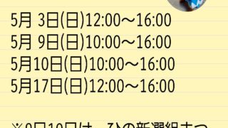 お知らせ 【5月の開館日】 【5月の開館日】5月3日(日)12時〜16時5月9日(土)10時〜16時 (ひの新選組まつり)5月10日(日)10時〜16時 (ひの新選組まつり)5月17日(日)12時〜16時皆様のお越しをお待ちしております😌 2026.04.15 お知らせ開館日
